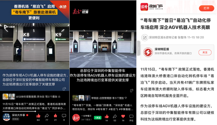 “AGV机器人停车及智能调度的技术突破不仅解决了跨境停车效率问题,更打通了人流、车流及海关、航班等多重壁垒。” 中集物联董事总经理程宏达表示,依托机关局和停车场的智能化系统,车主无需额外申办香港车牌、驾照,通过一站式平台即可完成预约、备案与投保,实现 “一脚油门到香港,机器人帮你停好车”。这一大亮点引发主流媒体高度关注,央视、广东电视台、南方日报、南方都市报、深圳特区报等媒体纷纷关注报道。媒体普遍认为,中集以科技赋能提升旅客出行体验,为 “粤车南下” 政策的顺利实施提供了关键保障,是粤港交通合作的亮眼成果。