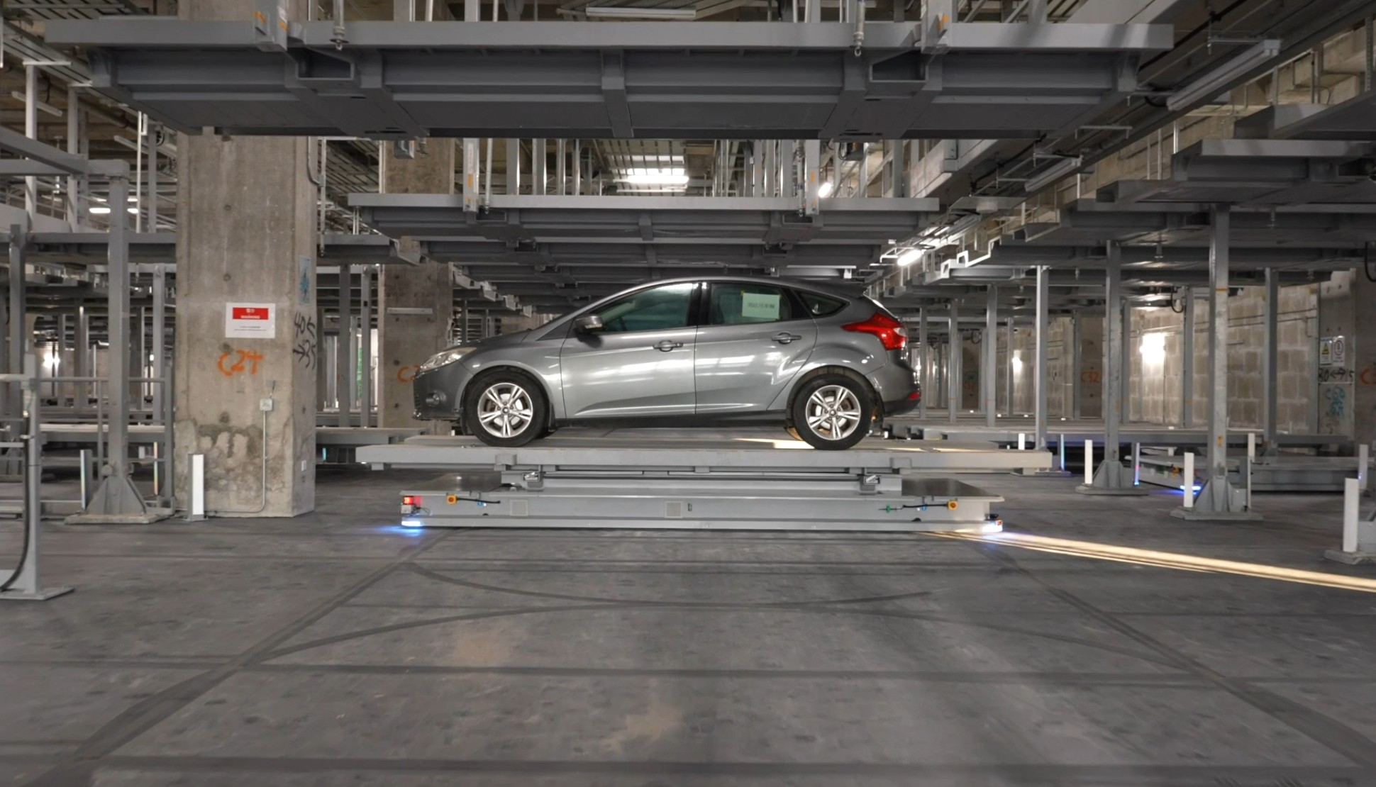 作为香港同类停车场规模纪录刷新者,中集物联旗下的深圳中集智能停车有限公司于2021年中标并于2024年下半年进场安装实施的“易泊飞”项目,坐落于港珠澳大桥香港口岸人工岛,首期开放1800个泊位(含1550个AGV机器人泊位),配套48台AGV机器人、21个入口与16个出口。车主体验流程格外便捷:无需办理香港出入境手续,只需将车辆驶入指定区域,下车核验证件并刷脸后,即可转乘接驳巴士前往机场,后续找位、泊车全由AGV机器人完成,彻底告别传统停车的繁琐与耗时。